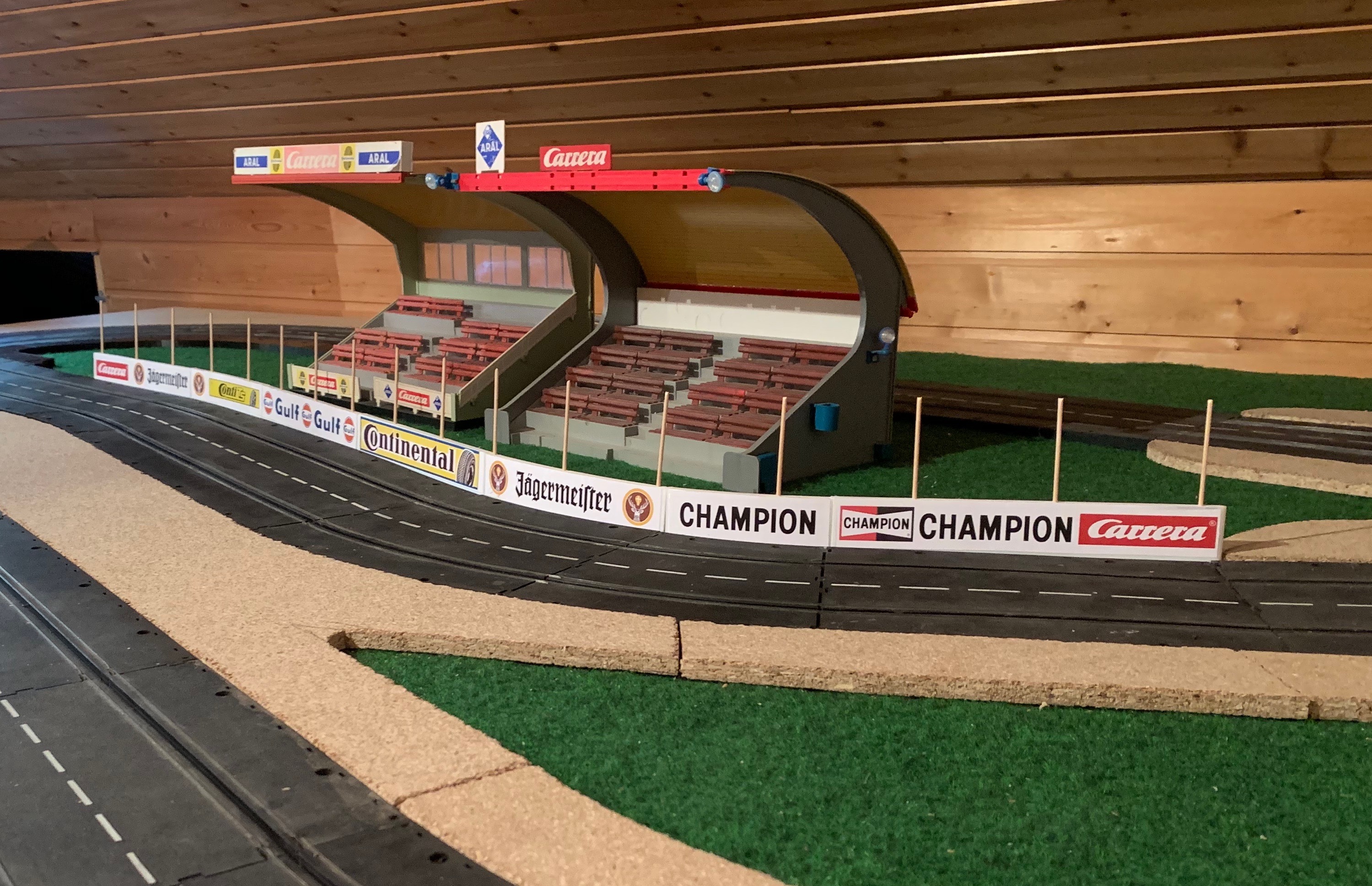 Damit die Zuschauer von der Tribüne nicht einfach so auf die Rennstrecke laufen, habe ich vor den Tribünen auch noch eine Mauer mit Fangzaun installiert. Das Design ist das gleiche wie bei der Boxenmauer, nur die Befestigung, zum Verschrauben auf der Platte, habe ich geändert, damit man sie von oben anschrauben kann. |