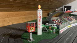 Shell-Säule Auch diese Shellsäule war ursprünglich ein Papierbausatz von Carrera4Fun. Die Säule habe ich auch wieder in 3D neugezeichnet und ausgedruck. Im Vordergrund der etwas 'modernere' Streckenposten ist aus Thingivers und auch ein 3D-Druck. |